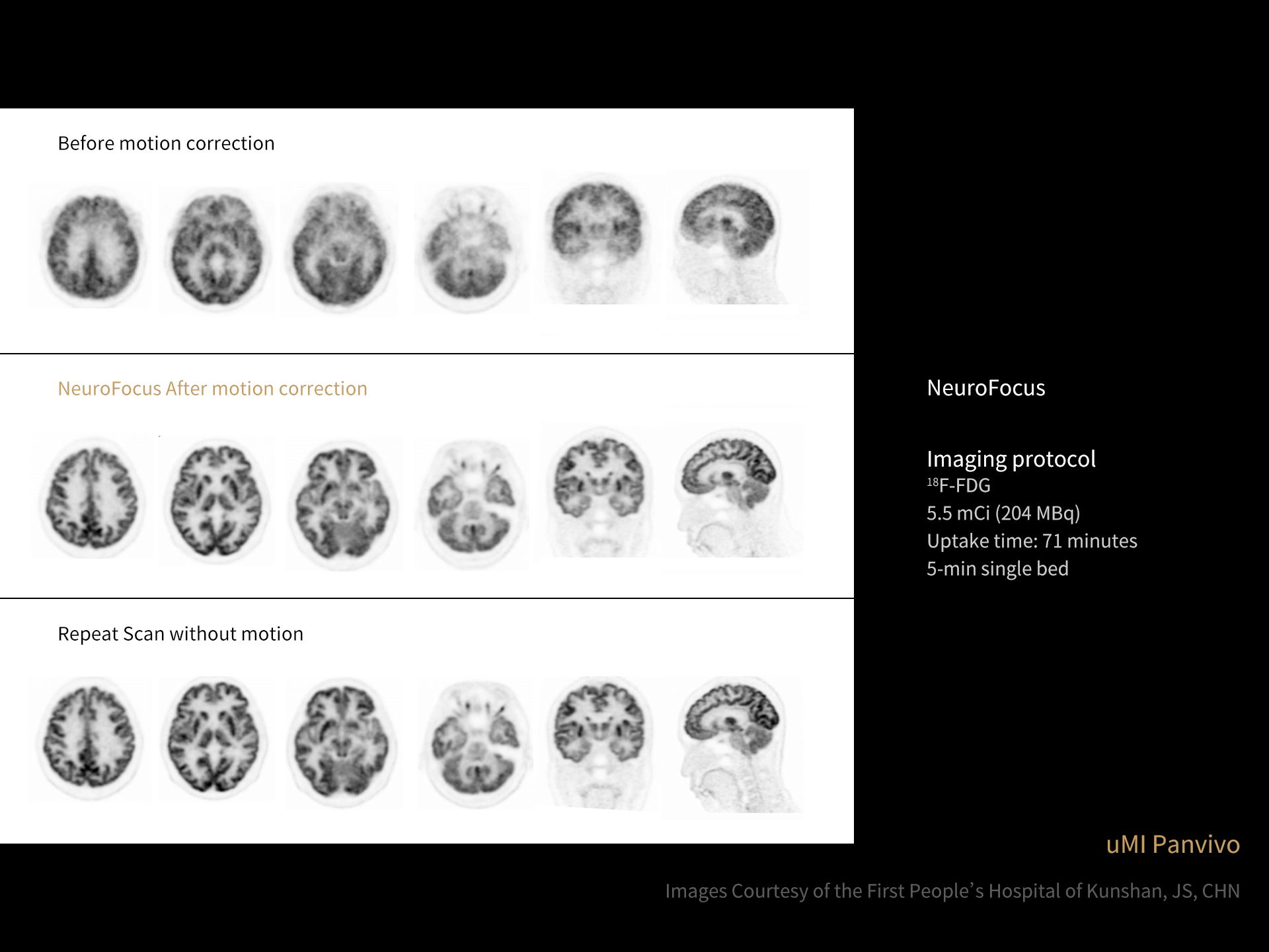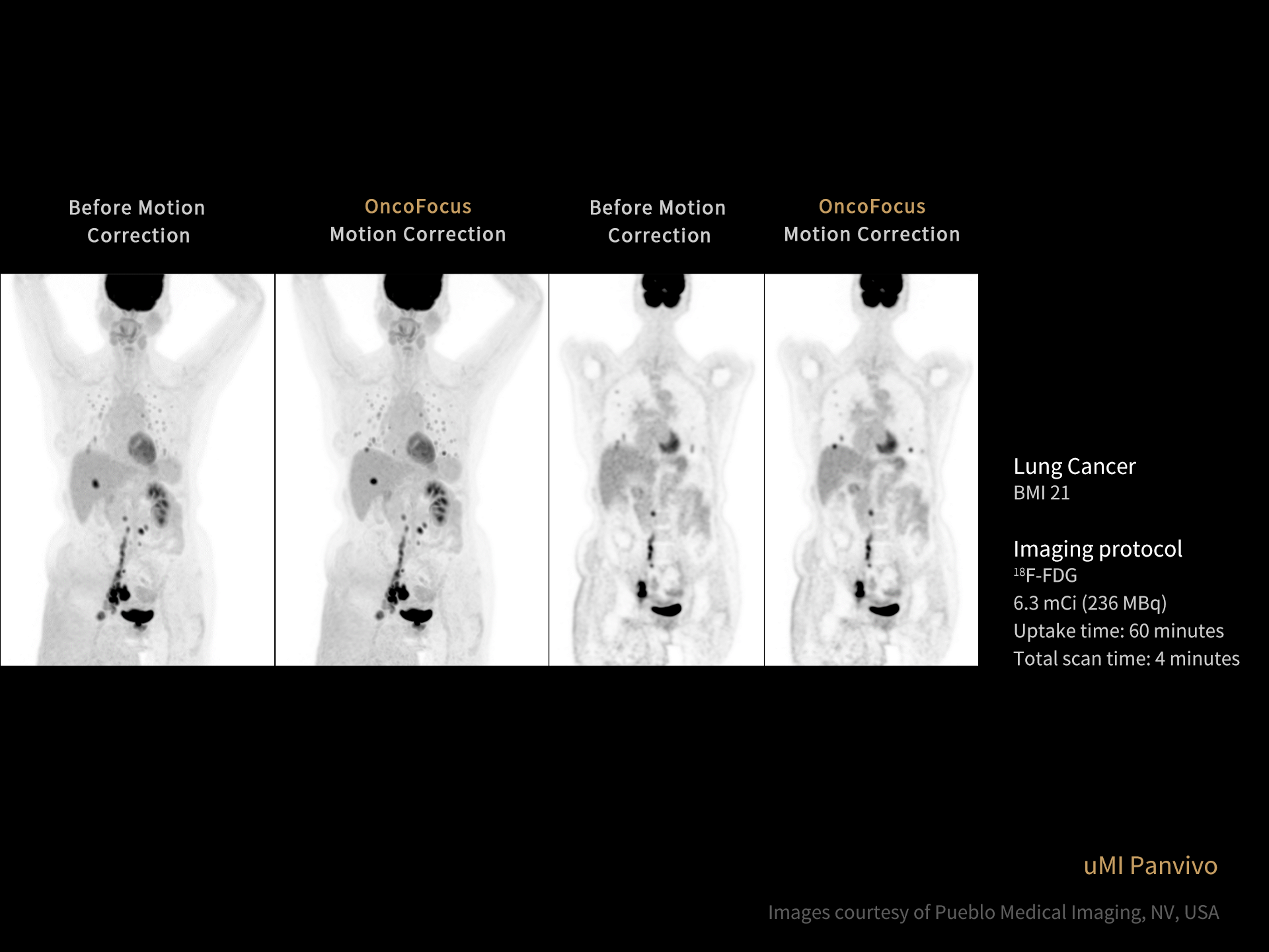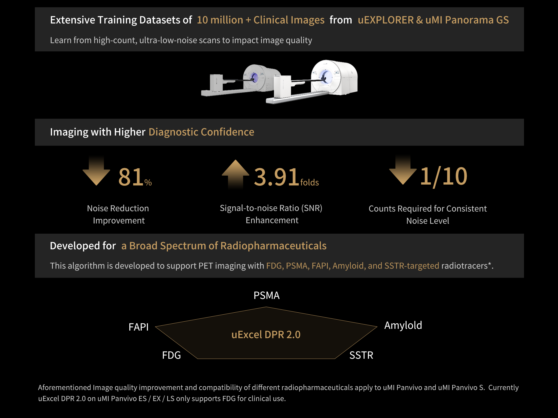 3. Aforementioned Image quality improvement and compatibility of different radiopharmaceuticals apply to uMI Panvivo and uMI Panvivo S. Currently uMI Panvivo ES and Panvivo EX only support FDG for clinical use. Currently uExcel DPR 2.0 on uMI Panvivo ES / EX / LS only supports FDG for clinical use.