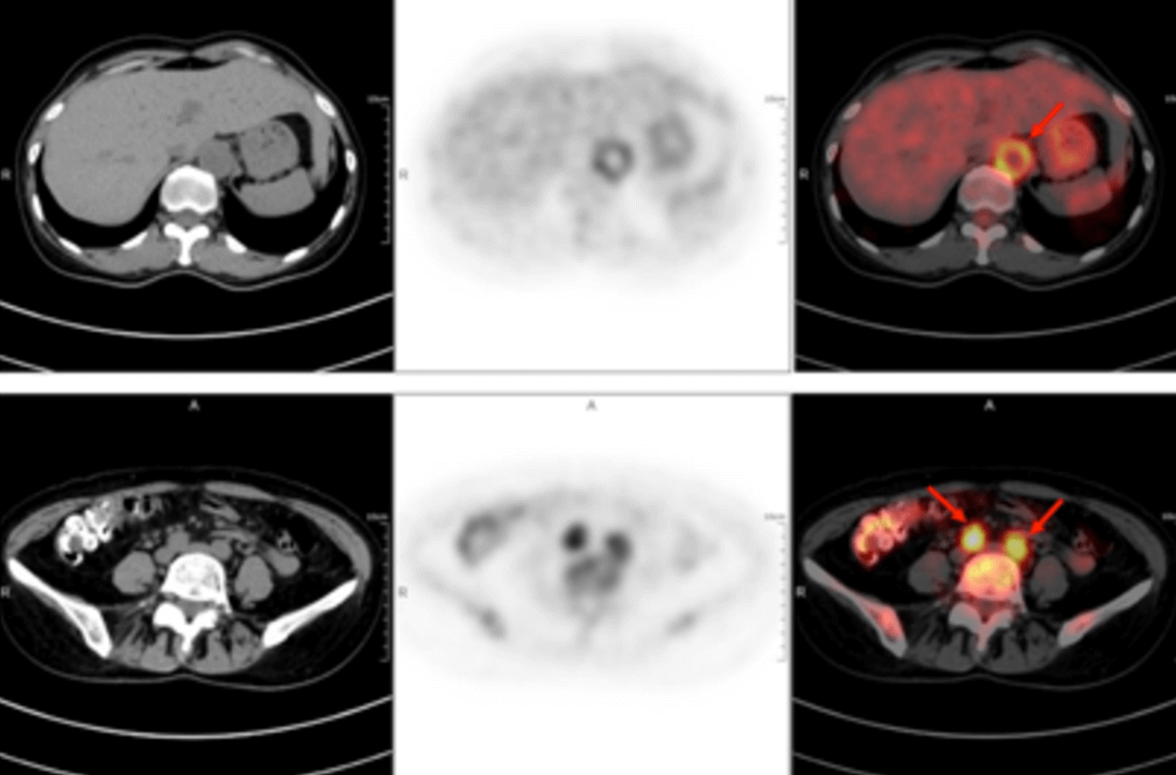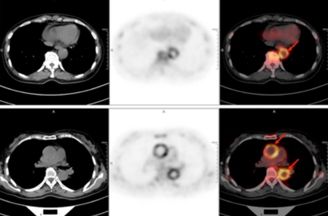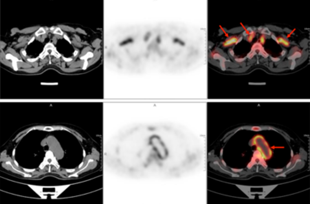 A 58-year-old women went to the hospital for intermittent fever for more than 40 days. Her highest body temperature was 38.9℃. Other symptoms included fatigue and shoulder joint pain which were especially acute in the afternoon and at night without cold, chills, sputum, hemoptysis, chest pain, chest tightness and shortness of breath. After two weeks of intravenous administration of "cephalosporin antibiotics" there was no improvement, and intermittent fever continued. The outpatient clinics noted the patient had "fever of unknown origin." There were no obvious diagnostic features upon physical examination. The results of a routine blood test were as follows: erythrocyte sedimentation rate in the first hour: 72mm; high-sensitivity C-reactive protein: 204. 20mg/l. Then, the patient had a whole-body F-FDG PET-CT examination to find the cause of the fever of unknown origin.