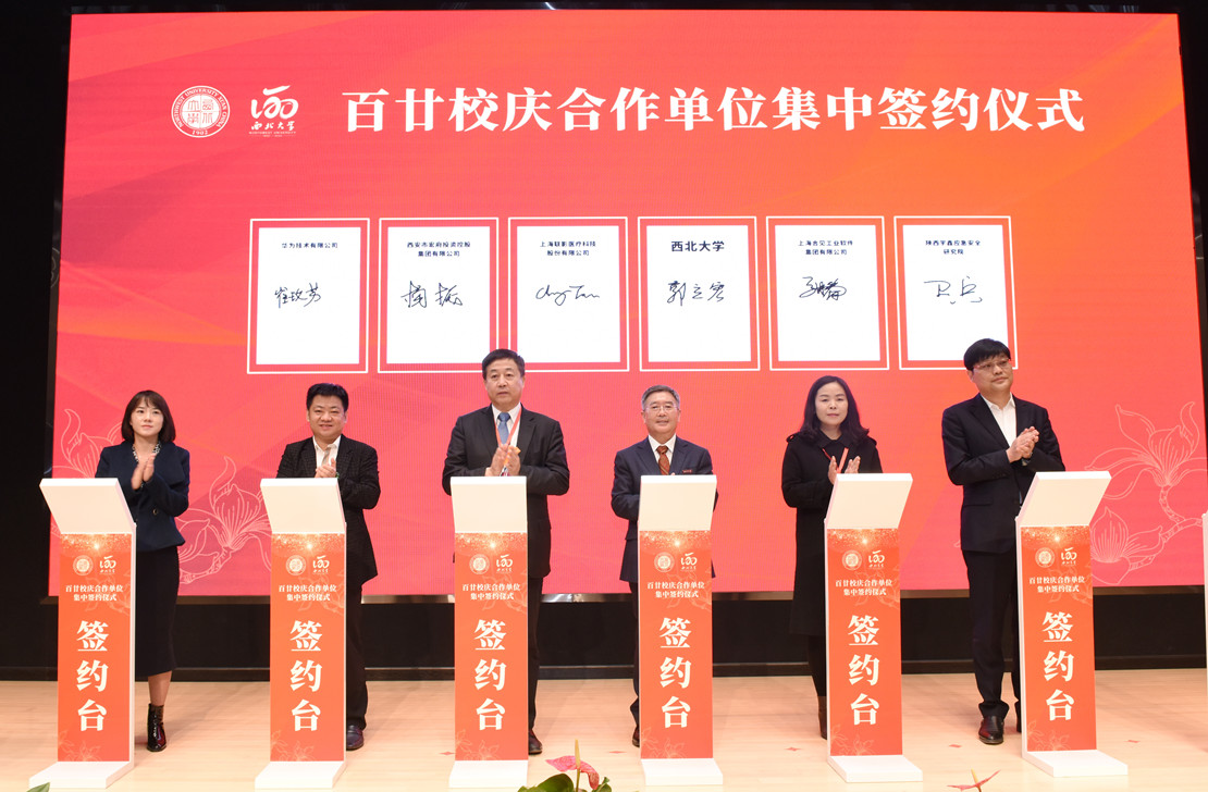 联影医疗与西北大学正式签署战略合作协议,西北大学校长郭立宏(右三)、联影医疗总裁谭国陞(左三)出席签约仪式