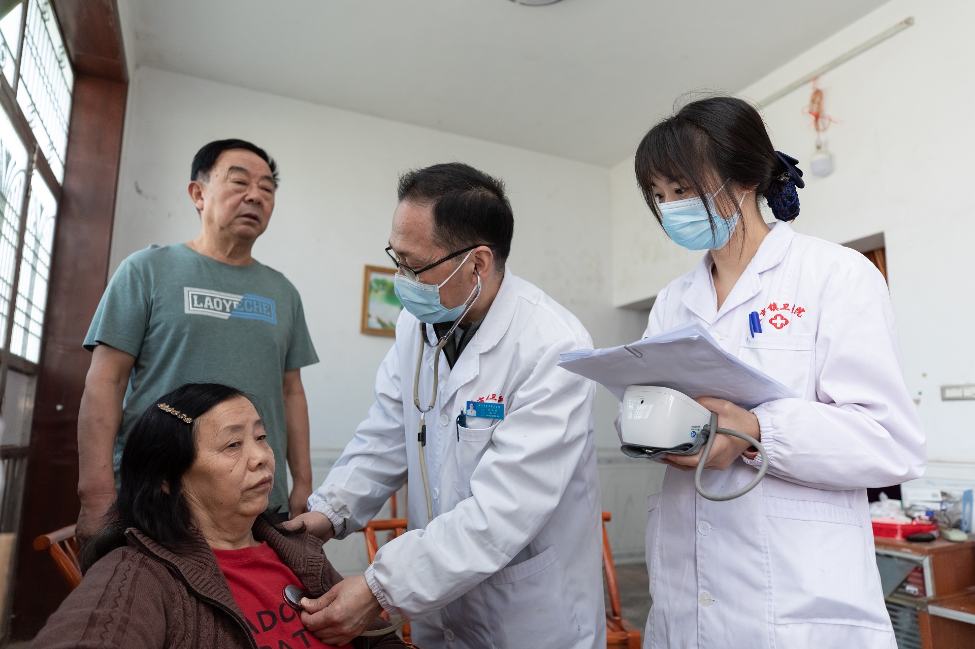 章明芬卒中救治返家后,董市卫生院医生仍定期下乡对其随访,老伴李家祥陪同在侧