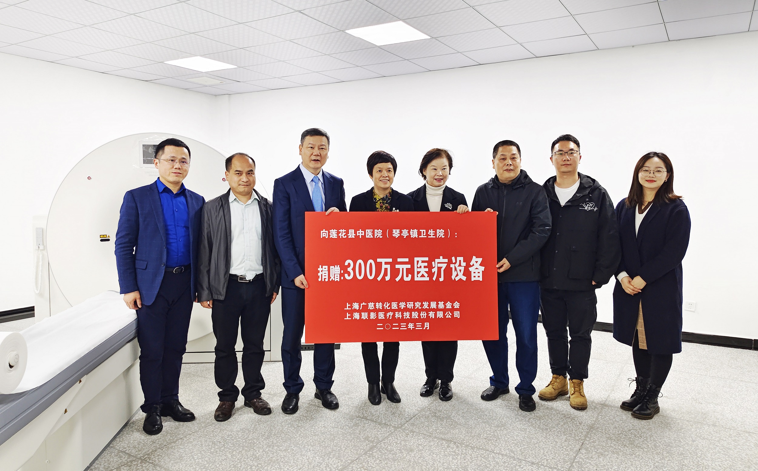 县委常委、宣传部长刘美兰(左4),上海广慈转化医学研究发展基金会秘书长汪敏(右4),联影医疗高级副总裁、中国业务联席总裁缪宏(左3)等领导嘉宾出席捐赠仪式