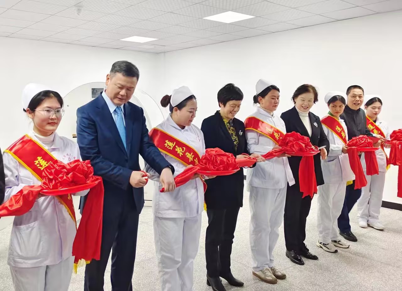 县委常委、宣传部长刘美兰(左4),上海广慈转化医学研究发展基金会秘书长汪敏(右4),联影医疗高级副总裁、中国业务联席总裁缪宏(左2)等领导嘉宾共同为联影医疗智能天眼CT开机剪彩