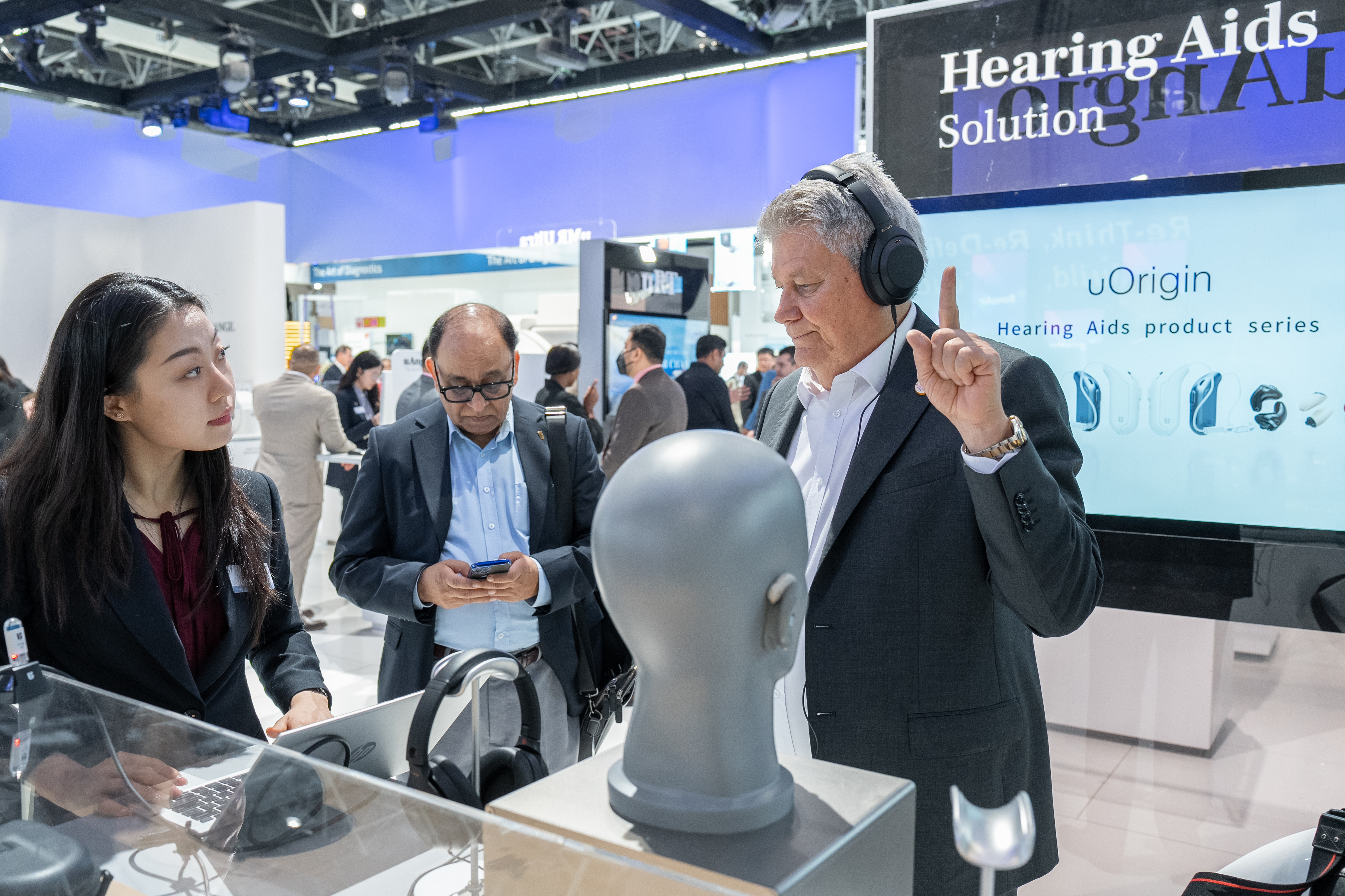作为集团全生命周期健康管理战略布局的关键落子,uOrigin 源系列助听器的首次国际亮相相当惊艳。一站式解决方案能满足全球市场多样化的用户需求;联影助听器自主研发芯片与算法技术,开发了(中文)听力平台、智能神经网络降噪算法、智能声场景、源头性啸叫抑制等独创性技术,深度模拟人耳听觉处理过程,为每位用户量身定制入耳放大、补偿策略等,提升用户的聆听清晰度、言语可懂度和舒适度,收获一众点赞。