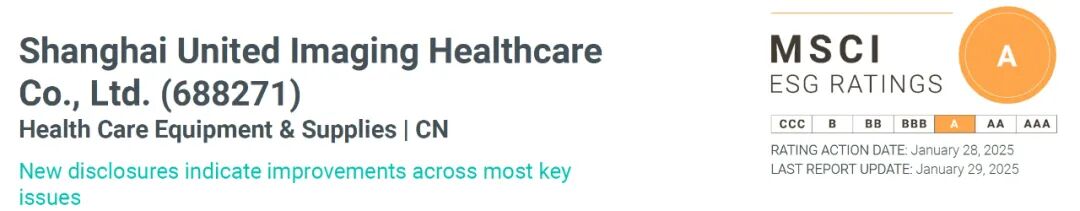 近日,国际权威指数机构摩根士丹利资本国际公司(Morgan Stanley Capital International,简称MSCI)公布了最新ESG评级结果,联影医疗的评级由B级跃升至A级,彰显了公司在可持续发展领域的卓越表现,并进一步巩固了其在全球医疗器械行业的领先地位。