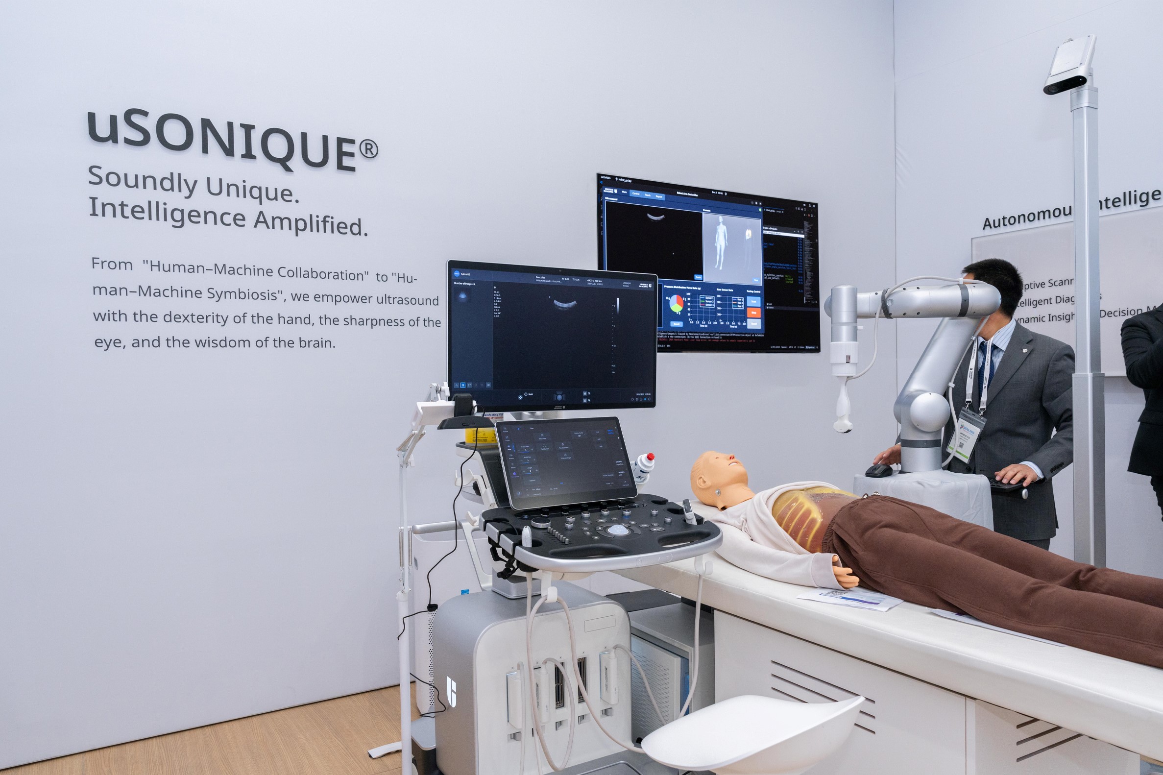 “配合联影 uSONIQUE 系列超声设备,超声自动扫查系统可驱动机械臂携带探头自主移动至目标扫查部位,通过影像导航以及多模态行为大模型,来进行精准压力调节和在线运动规划,获取标准化诊断切面,这既能避免人工扫查的质量差异,又省去超声技师反复调整和记录的时间,扫查结束后可一键生成结构化报告,目前其已实现甲状腺、肝脏等部位的超声检查,未来有望拓展至更多部位。” 展台工作人员介绍道。