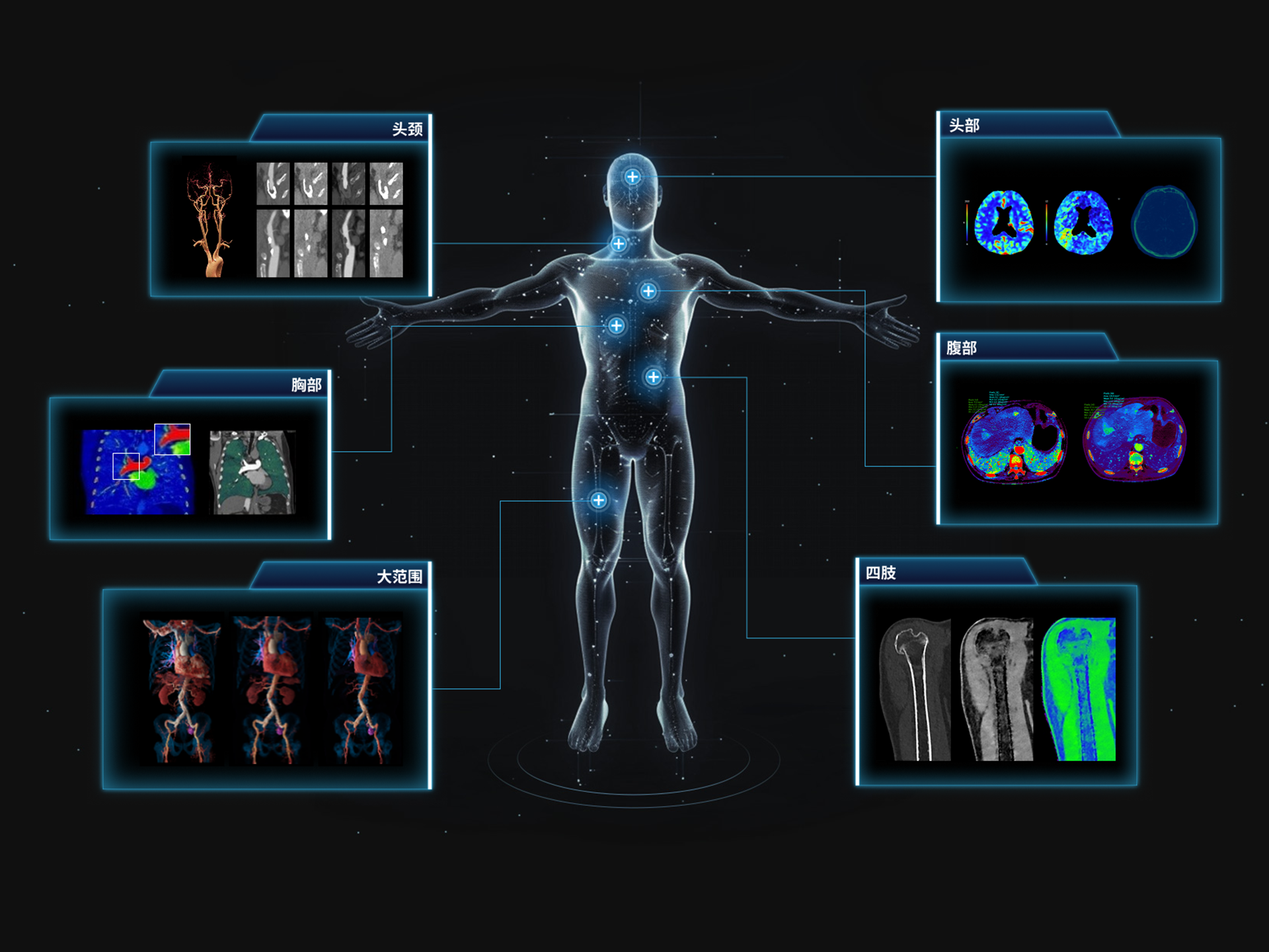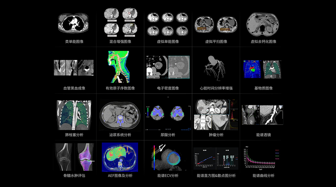 能谱成像可揭示丰富的物质与能量信息,其临床价值的充分释放有赖于完善高效的后处理分析平台。uCT SiriuX® 提供全面能谱高级分析工具,覆盖心血管、肿瘤、神经、骨科等多类临床场景。平台支持动脉增强分数分析(AEF)、细胞外容积分析(ECV)、肿瘤同源性分析、肺栓塞分析、骨髓水肿分析等多项评估,并提供多达10种基物质对成像,为精准诊断与科研探索提供坚实支撑。